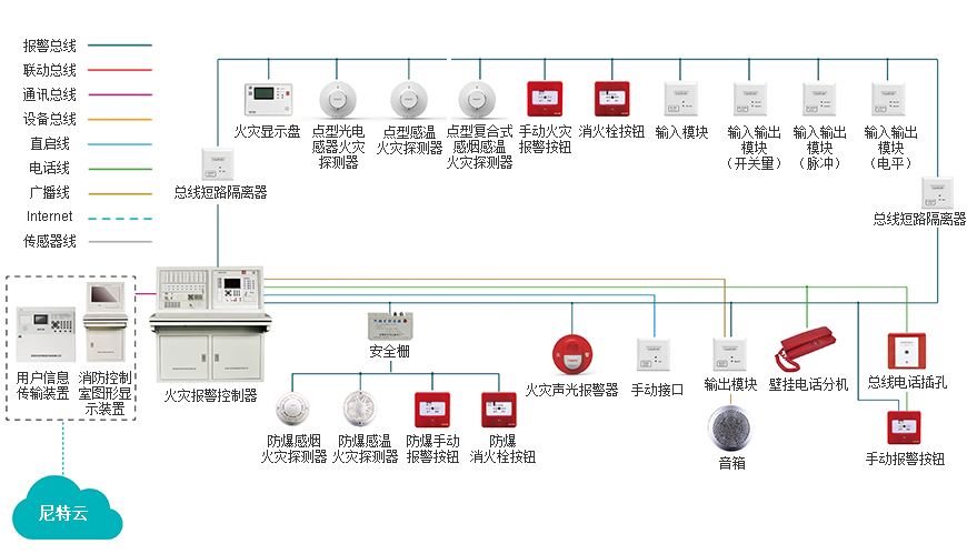 “四線制”解決方案符合國家標準 GB 50116-2013《火災(zāi)自動報警系統(tǒng)設(shè)計規(guī)范》的要求,以 NT8001 火災(zāi)報警控制器和 NT9011 消防控制室圖形顯示裝置為核心,報警總線采用成熟的 FT-BUS 全數(shù)字總線技術(shù),并且可兼容二線制產(chǎn) 品,系統(tǒng)配置靈活。系統(tǒng)采用標準 CAN 總線通信協(xié)議,可通過用戶信息傳輸裝置與“尼特云”智慧消防平臺相連。 圖形顯示裝置兼容標準 RS232/RS485 通訊接口,可實現(xiàn)與消防一體化系統(tǒng)和“尼特云”智慧消防平臺的連接。 系統(tǒng)采用多種自測試、自診斷技術(shù),具有構(gòu)成完整、配置靈活和運行可靠的特點。