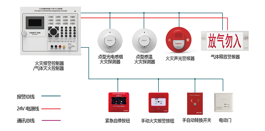 氣體滅火控制系統(tǒng)以 NT8035 火災報警控制器 / 氣體滅火控制器或 NT8033 氣體滅火控制器為核心??赏ㄟ^ CAN 總線與火災報警控制器通訊??煽刂破叻椤馊苣z、二氧化碳等氣體滅火設備。