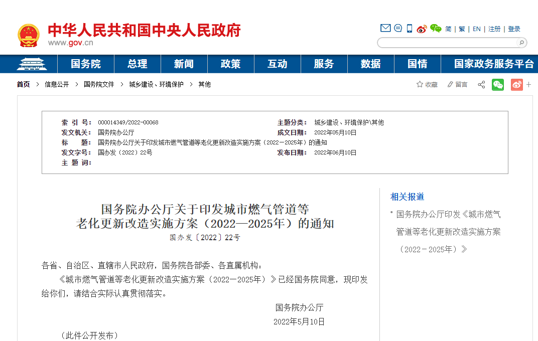 (三)工作目標。在全面摸清城市燃氣、供水、排水、供熱等管道老化更新改造底數(shù)的基礎上,馬上規(guī)劃部署,抓緊健全適應更新改造需要的政策體系和工作機制,加快開展城市燃氣管道等老化更新改造工作,徹底消除安全隱患。2022年抓緊啟動實施一批老化更新改造項目。2025年底前,基本完成城市燃氣管道等老化更新改造任務。