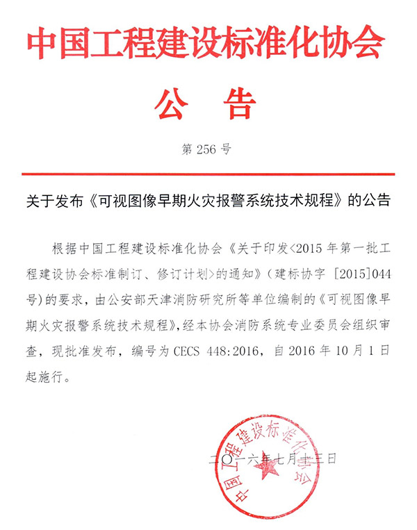 根據(jù)中國(guó)工程建設(shè)標(biāo)準(zhǔn)化協(xié)會(huì)《關(guān)于印發(fā)<2015年第一批工程建設(shè)協(xié)會(huì)標(biāo)準(zhǔn)制訂、修訂計(jì)劃>的通知》(建標(biāo)協(xié)字[2015]044號(hào))的要求,由天消所主編,國(guó)家消防工程技術(shù)研究中心、華東建筑設(shè)計(jì)研究總院,天津、上海、廣東、云南省公安消防總隊(duì),北京市文物局、等單位共同參編的《可視圖像早期火災(zāi)報(bào)警系統(tǒng)技術(shù)規(guī)程》現(xiàn)已由中國(guó)工程建設(shè)標(biāo)準(zhǔn)化協(xié)會(huì)發(fā)布,2016年10月1日起開始實(shí)施。