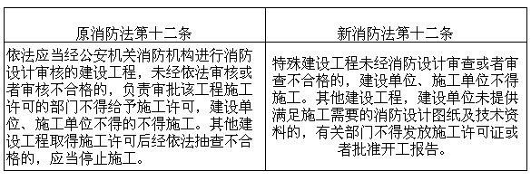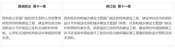解讀: 原消防法的規(guī)定主要是體現(xiàn)了公安部消防機關(guān)的具體職能,新法規(guī)則體現(xiàn)了機構(gòu)職能的轉(zhuǎn)變,特殊建設(shè)工程審查由住建部負責。同時,雖然新法規(guī)取消了對“設(shè)計備案”的要求,但仍需提供“消防設(shè)計圖紙及技術(shù)資料”,過去是先取證再備案,現(xiàn)在是先提交再取證,對于消防工作本身,不僅沒有弱化,反而更強化。