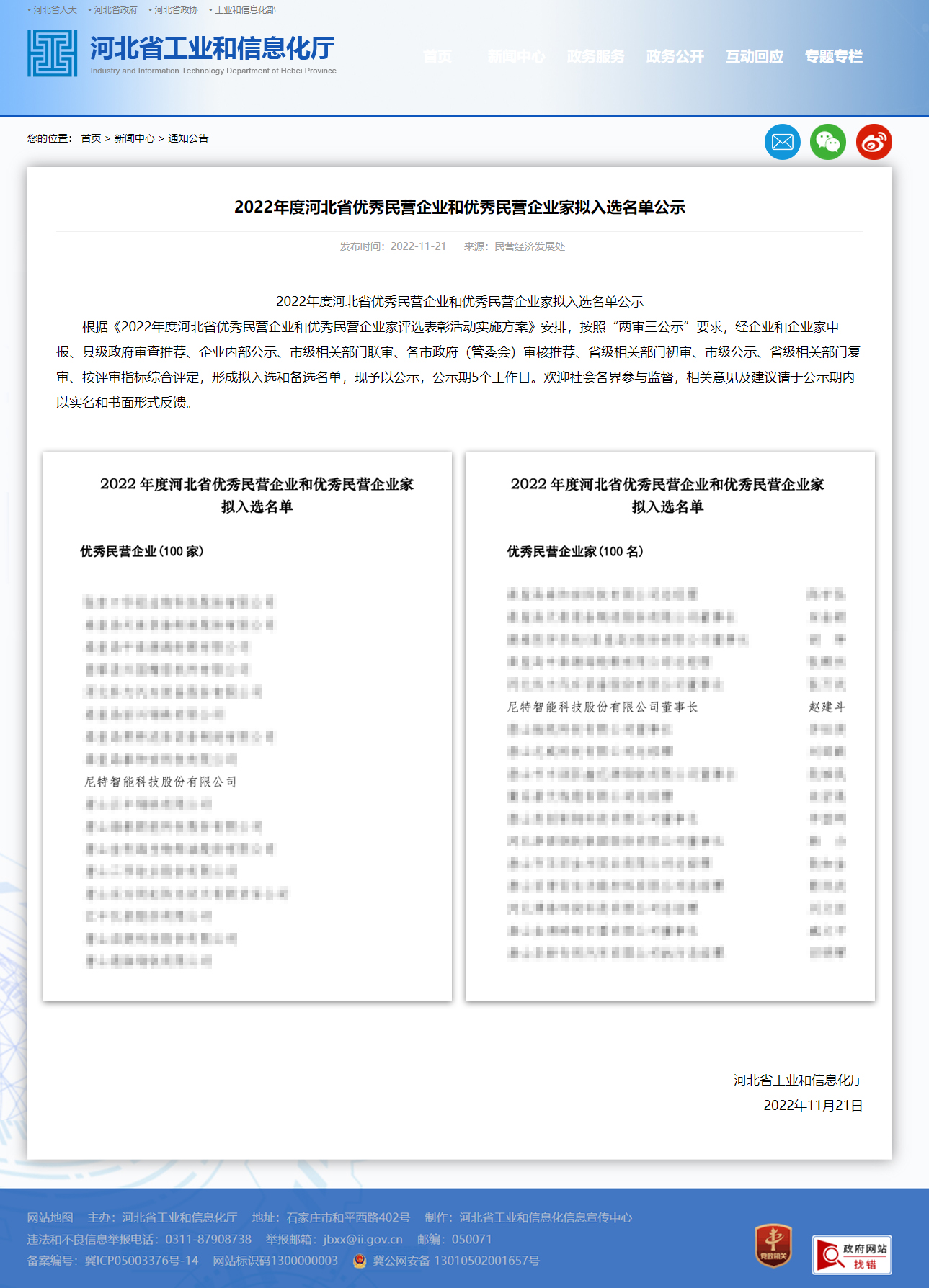 河北省優(yōu)秀民營企業(yè)和優(yōu)秀民營企業(yè)家主要對民營企業(yè)中具有先進的經(jīng)營發(fā)展理念、經(jīng)濟效益顯著、創(chuàng)新發(fā)展和轉型升級典型示范性強、在提升河北品牌知名度上具有一定影響力的企業(yè)和企業(yè)家予以認定。尼特憑借在行業(yè)內(nèi)的優(yōu)秀表現(xiàn),在眾多企業(yè)中脫穎而出,成功雙入選。
