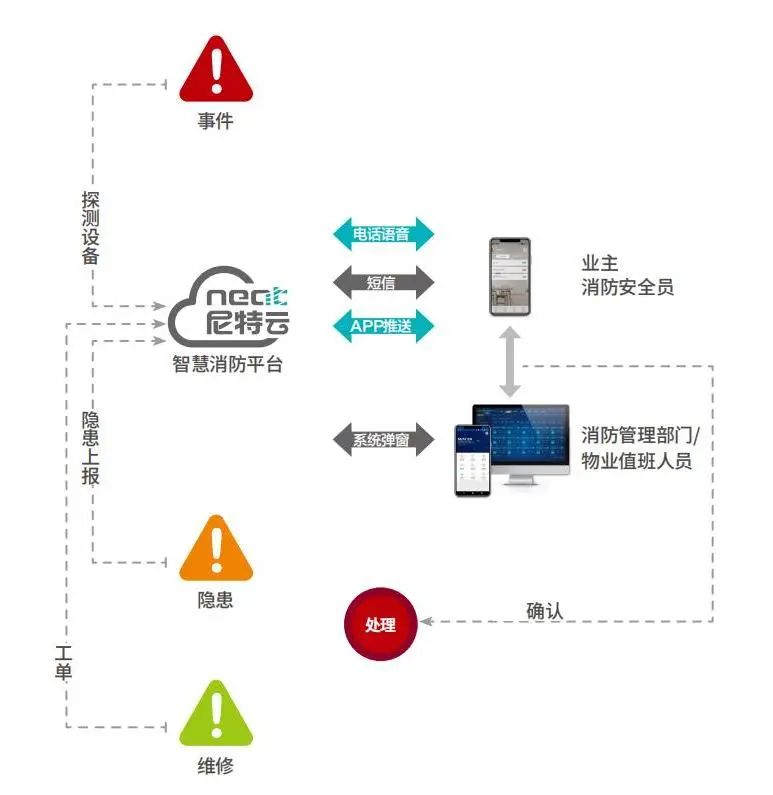 尼特前端感知設(shè)備可以實(shí)時(shí)監(jiān)測(cè)高層住宅內(nèi)煙霧、可燃?xì)怏w、電氣火災(zāi),及時(shí)發(fā)現(xiàn)火災(zāi)隱患,發(fā)生異常情況,第一時(shí)間將數(shù)據(jù)實(shí)時(shí)傳輸至尼特云智慧消防管理平臺(tái),并通過語音電話、短信、小尼平安APP推送等多種方式及時(shí)通知給業(yè)主或物業(yè)進(jìn)行復(fù)核,監(jiān)管中心同步聯(lián)動(dòng)復(fù)核,借助多層級(jí)消防預(yù)警將安全隱患扼殺在萌芽狀態(tài)。