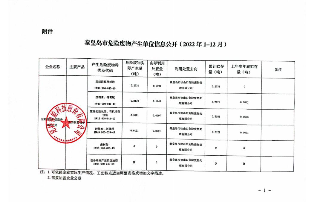 尼特公司2022年危險廢物產(chǎn)生單位信息公開