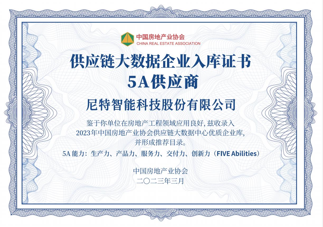 源于對“專注、專業(yè)”品牌精神的執(zhí)著,尼特連續(xù)6年榮登榜單,并以5A供應(yīng)商身份成功入選“2023年中國房地產(chǎn)業(yè)協(xié)會供應(yīng)鏈大數(shù)據(jù)中心優(yōu)質(zhì)企業(yè)庫”,彰顯了尼特持續(xù)增強的綜合實力和影響力,背后是房地產(chǎn)業(yè)界對尼特品牌力與服務(wù)品質(zhì)的切實肯定。