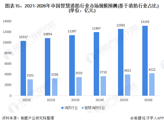據(jù)前瞻產(chǎn)業(yè)研究院數(shù)據(jù)顯示,預(yù)計(jì)2026年中國(guó)消防行業(yè)市場(chǎng)規(guī)模將達(dá)到13193億元,2021~2026年智慧消防行業(yè)滲透率預(yù)計(jì)達(dá)到30%以上。據(jù)此,預(yù)計(jì)到2026年,我國(guó)智慧消防系統(tǒng)市場(chǎng)規(guī)模將達(dá)到4222億元。市場(chǎng)潛力巨大,發(fā)展前景廣闊!