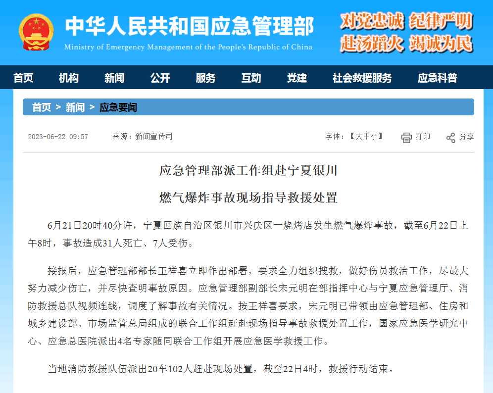 6月21日20時40分許,寧夏回族自治區(qū)銀川市興慶區(qū)富洋燒烤店發(fā)生燃?xì)獗ㄊ鹿?,截?月22日8時,事故造成31人死亡、7人受傷。