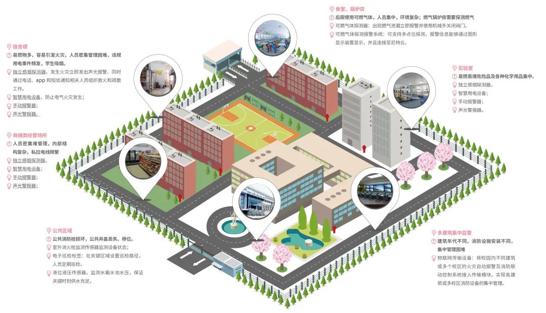 作為專業(yè)的物聯(lián)網(wǎng)消防企業(yè),尼特智能擁有一套完備的校園智慧消防解決方案,針對校園內(nèi)宿舍、食堂、教學(xué)樓等場景建立了高效的火災(zāi)報警預(yù)警機(jī)制。以“預(yù)防為主,防消結(jié)合”為理念,尼特智能精準(zhǔn)定位各類校園的消防安全隱患,通過在高校宿舍安裝獨(dú)立聯(lián)網(wǎng)的智能探測設(shè)備,實(shí)時感知警情信息并上傳至尼特云智慧消防管理平臺,讓火災(zāi)救早滅小。
