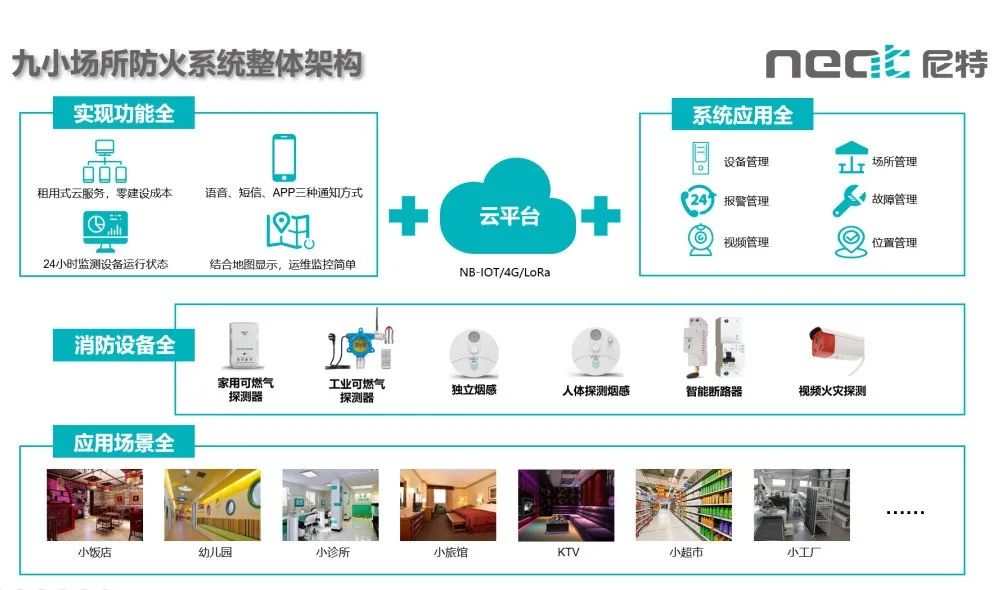 為破解“九小場(chǎng)所”的火災(zāi)預(yù)警和監(jiān)管難題,尼特運(yùn)用物聯(lián)網(wǎng)核心技術(shù),推出九小場(chǎng)所智慧消防解決方案,通過獨(dú)立式感煙火災(zāi)探測(cè)器、獨(dú)立可燃?xì)怏w探測(cè)器、智能斷路器等前端感知設(shè)備實(shí)時(shí)監(jiān)測(cè)火警情況,發(fā)生異常情況,第一時(shí)間將數(shù)據(jù)實(shí)時(shí)傳輸至尼特云智慧消防平臺(tái),并通過語(yǔ)音電話、短信、小尼平安APP推送等多種方式及時(shí)通知給用戶可第一時(shí)間現(xiàn)場(chǎng)復(fù)核,相關(guān)監(jiān)管部門同步聯(lián)動(dòng)復(fù)核,進(jìn)一步實(shí)現(xiàn)火情的早發(fā)現(xiàn)、早處理。