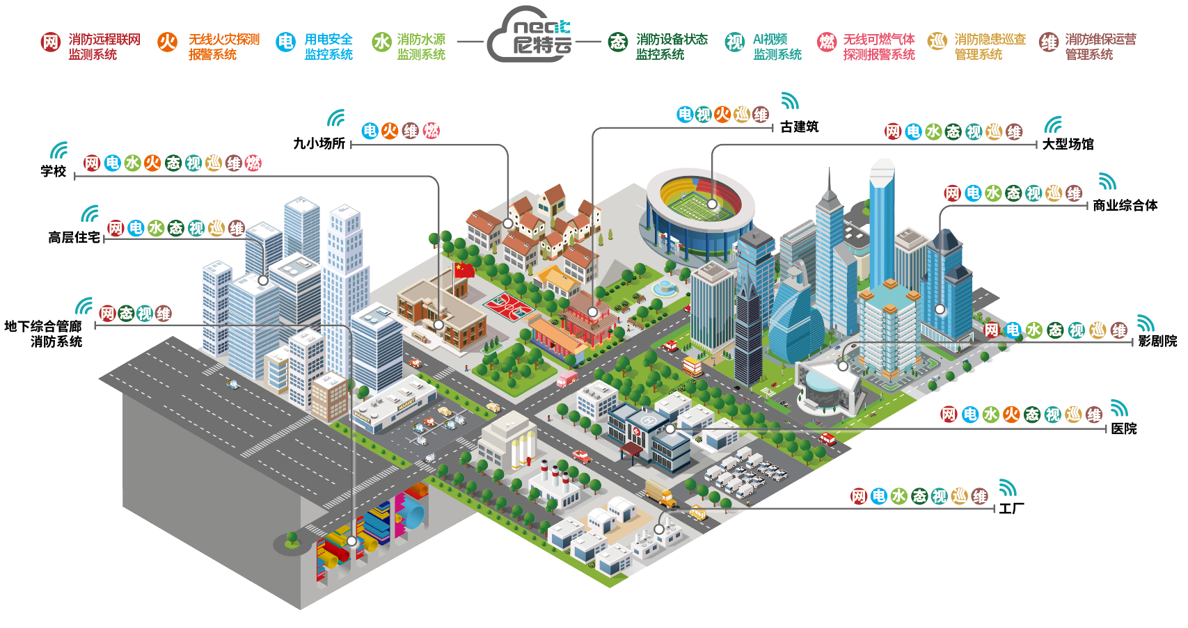 圍繞“一平臺(tái)+多系統(tǒng)+全場(chǎng)景應(yīng)用”通過(guò)尼特云智慧消防管理平臺(tái)將各系統(tǒng)進(jìn)行集中管理,實(shí)現(xiàn)對(duì)場(chǎng)景內(nèi)“煙、溫、火、電、氣、水”的實(shí)時(shí)監(jiān)測(cè)與監(jiān)控,消除火災(zāi)隱患。