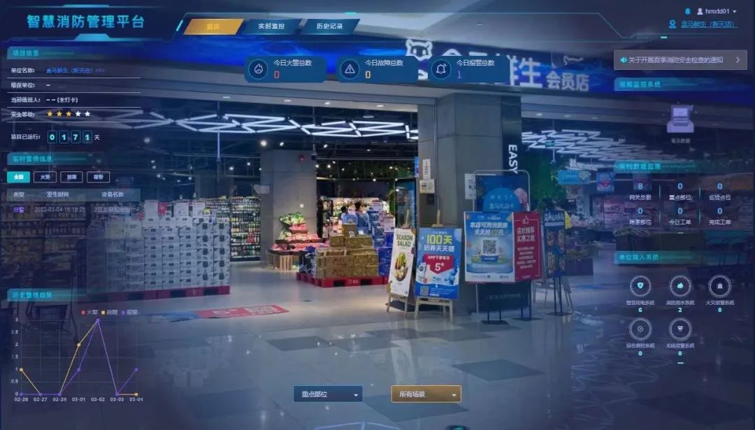尼特云智慧消防管理平臺支持快速接入商超內原有視頻及消防物聯(lián)感知設備,對消防安全系統(tǒng)等進行實時監(jiān)控,“一張圖”掌握連鎖商超整套火災風險情況;