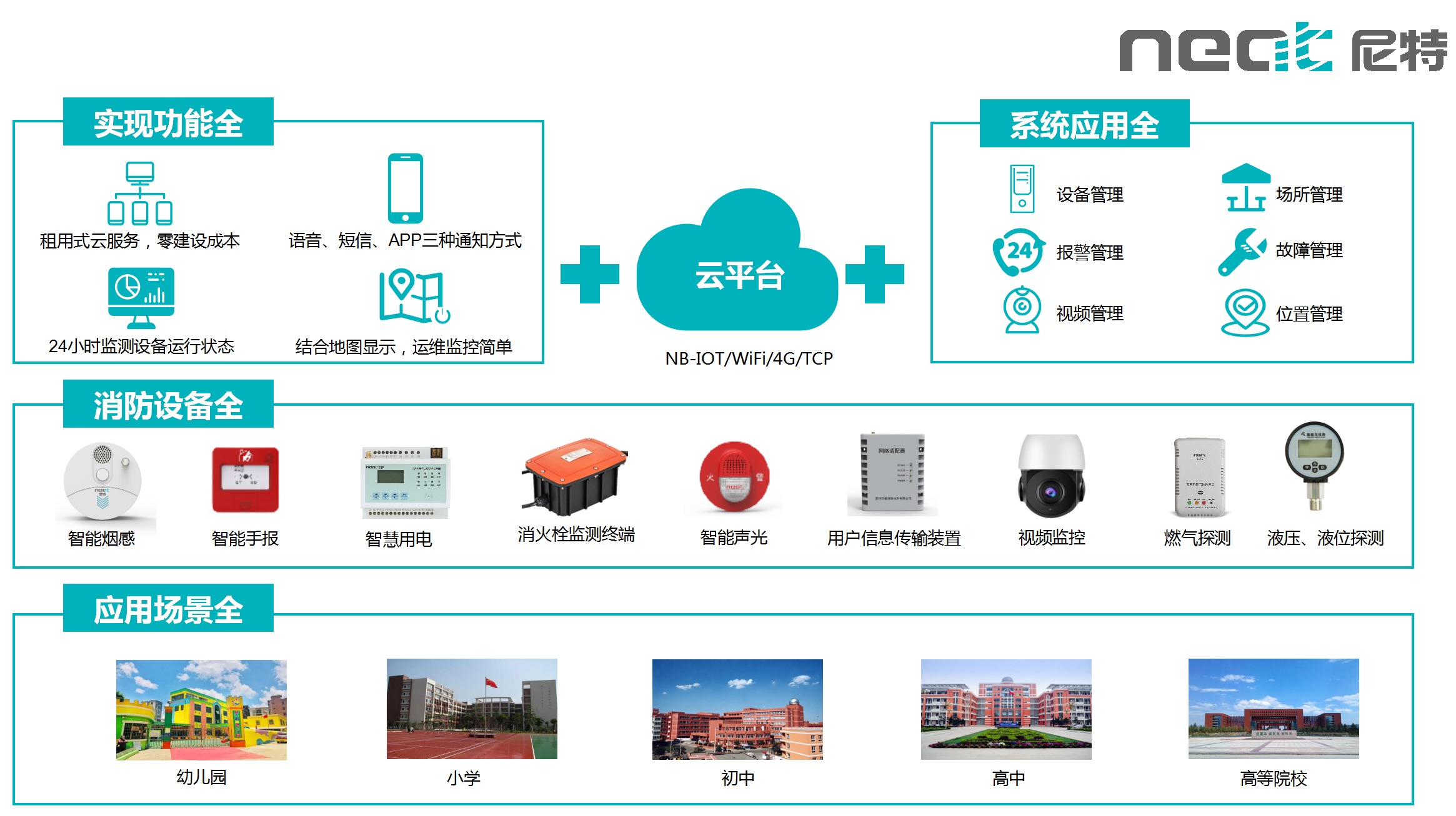 尼特智能通過(guò)在學(xué)校內(nèi)部署煙、氣、電等智能終端設(shè)備,創(chuàng)新性將中小學(xué)、幼兒園消防安全日常管理與數(shù)字化手段相結(jié)合,以物聯(lián)和數(shù)聯(lián)為基礎(chǔ),打通各種消防設(shè)備數(shù)據(jù)和消防工作數(shù)據(jù),與視頻監(jiān)控快速聯(lián)動(dòng),實(shí)現(xiàn)火情的快速確認(rèn),構(gòu)建起新型校園安全管理機(jī)制,助力打造中小學(xué)、幼兒園消防安全智慧化能力引擎。