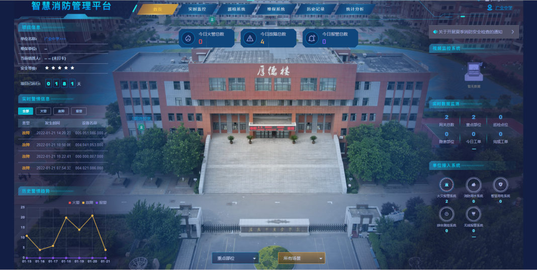 解決方案:針對(duì)學(xué)校基本信息、建筑信息、重點(diǎn)部位信息、消防設(shè)施信息、人員信息等消防相關(guān)信息,建立尼特云智慧消防管理平臺(tái),對(duì)各類消防設(shè)施進(jìn)行實(shí)時(shí)監(jiān)測(cè),方便清晰了解校園內(nèi)每個(gè)區(qū)域的消防情況,協(xié)助決策。
