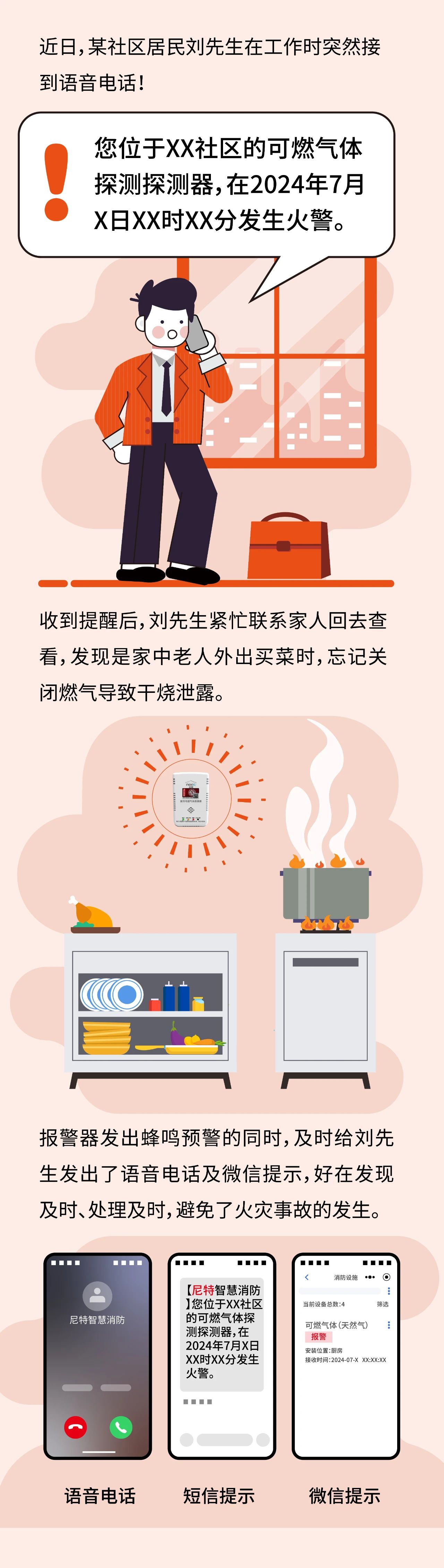 為了滿足不同客戶需求,尼特智能打造了超高精準(zhǔn)型催化燃燒可燃?xì)怏w探測(cè)器與簡(jiǎn)單普適型半導(dǎo)體可燃?xì)怏w探測(cè)器,支持4Gcat1、NB-IoT、本地獨(dú)立式等多種通訊方式,均采用免布線設(shè)計(jì),可通過(guò)小尼平安APP實(shí)現(xiàn)遠(yuǎn)程自檢、遠(yuǎn)程消音、遠(yuǎn)程關(guān)閥等操作,以電話語(yǔ)音、短信、APP、網(wǎng)頁(yè)推送等方式將燃?xì)怆[患信息通知至多位相關(guān)人員,真正做到險(xiǎn)情早發(fā)現(xiàn)、早通知、早處置,防患于未“燃”。