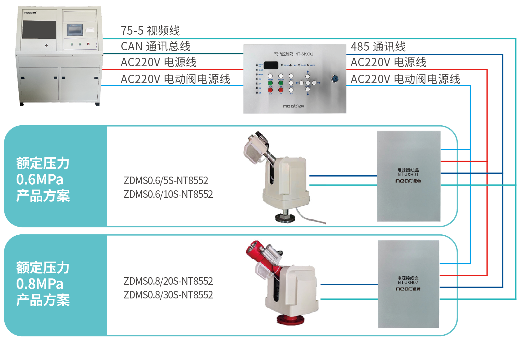 根據(jù)場景額定壓力不同,方案分為0.6MPa和0.8MPa兩種類別,均以RS485通訊線與現(xiàn)場控制器高效完成數(shù)據(jù)傳輸,采集的信息通過CAN總線通訊上傳至集中控制裝置,反應速度快,操作更便捷。一旦發(fā)現(xiàn)火災,滅火裝置迅速啟動,將噴口瞄準火源,分別可在30秒和60秒內完成精確定位,同時發(fā)出報警信號,聯(lián)動電磁閥、水泵,對火點實施定點射水滅火,滅火后自動停止,如有復燃,重新啟動,直至徹底熄滅為止。