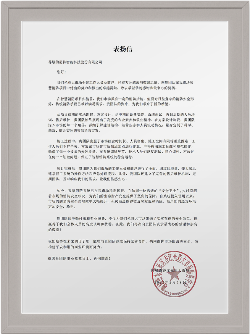 在信的結(jié)尾,市場(chǎng)工作人員及商戶用最樸實(shí)卻最真摯的話語表達(dá)了對(duì)值守中心人員及尼特智能產(chǎn)品的感謝。他們說,智慧消防系統(tǒng)已成為忠誠的“安全衛(wèi)士”,有了它,市場(chǎng)消防安全管理效率大幅提升。未來,我們將繼續(xù)努力,讓智慧消防產(chǎn)品走進(jìn)更多的場(chǎng)所,守護(hù)更多人的生命財(cái)產(chǎn)安全,不負(fù)這份信任與期待。