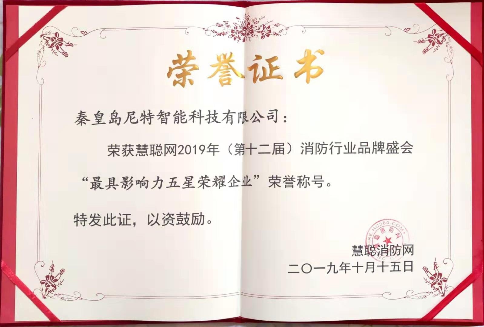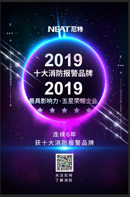 2019年10月15日,“2019(第十二屆)中國(guó)消防行業(yè)品牌盛會(huì)”上,尼特再度被評(píng)選為【十大消防報(bào)警品牌】,并同時(shí)上榜【最具影響力·五星榮耀企業(yè)】,自2014年首登榜單以來(lái),尼特已連續(xù)六年榮獲“十大品牌”殊榮。