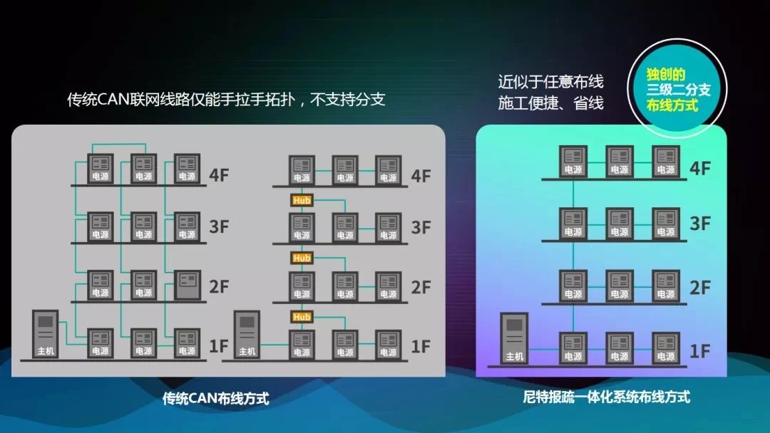 針對項目的以上問題,尼特消防報疏一體化系統(tǒng)能夠更好的滿足項目訴求,系統(tǒng)優(yōu)勢驟顯,一方面,該系統(tǒng)采用全二線制設(shè)計,減少近半的布線成本和工作量,同時獨創(chuàng)“三級二分支”布線方式,無需加Hub可自由布線,省工省線省成本;另一方面,該系統(tǒng)實現(xiàn)了火災(zāi)報警系統(tǒng)和智能疏散系統(tǒng)的高度集成,通過提高砝碼占空比和斜率補償技術(shù),保證了總線的帶載能力和系統(tǒng)穩(wěn)定性,較好地滿足了該項目在節(jié)省成本、方便施工和系統(tǒng)穩(wěn)定性方面的需求!