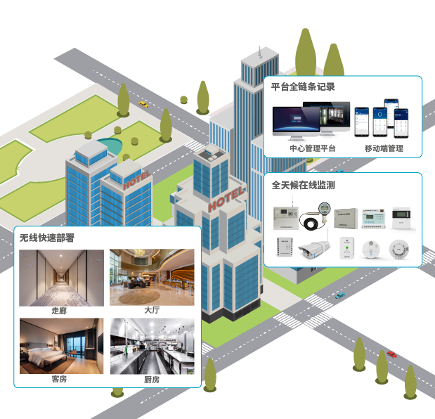 設(shè)備部署無需開槽布線,操作簡單,可以快速安裝在酒店客房、走廊、大廳、廚房等多場所,且不影響酒店正常營業(yè),產(chǎn)品自身功耗低,配套電池使用壽命長,大大減少了日常維護(hù)工作,同時(shí)為酒店消防安全建設(shè)帶來了極大便利。