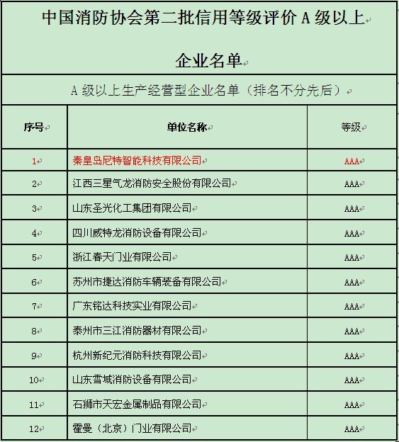 2012年10月,秦皇島尼特智能科技有限公司在中國消防協(xié)會消防行業(yè)信用等級評價(jià)A級以上企業(yè)評選中以綜合評分第一名被授予...