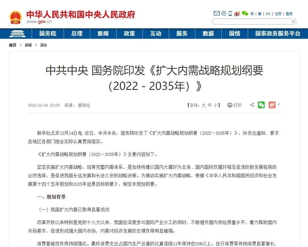 近日,中共中央、國務(wù)院印發(fā)《擴(kuò)大內(nèi)需戰(zhàn)略規(guī)劃綱要(2022—2035年)》(以下簡稱《綱要》),并發(fā)出通知,要求各地區(qū)各部門結(jié)合實(shí)際認(rèn)真貫徹落實(shí)。 其中,《綱要》單列“推動...