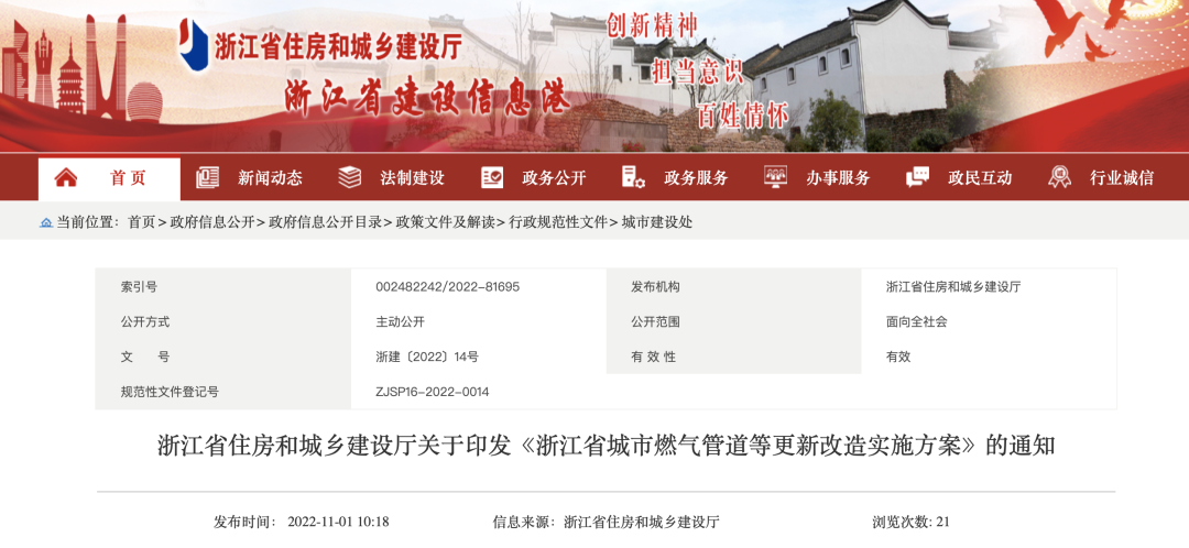浙江省城市燃氣管道等更新改造實施方案 根據(jù)國務院辦公廳《關于印發(fā)城市燃氣管道等老化更新改造實施方案(2022-2025年)的通知》(國辦發(fā)〔202...