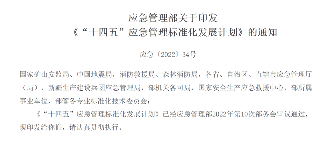 全文如下 應(yīng)急管理標(biāo)準(zhǔn)化是新時(shí)期應(yīng)急管理戰(zhàn)略性、引領(lǐng)性、基礎(chǔ)性工作,是推進(jìn)應(yīng)急管理體系和能力現(xiàn)代化的重要戰(zhàn)略舉措。為深入貫徹落實(shí)《國家標(biāo)準(zhǔn)化發(fā)...
